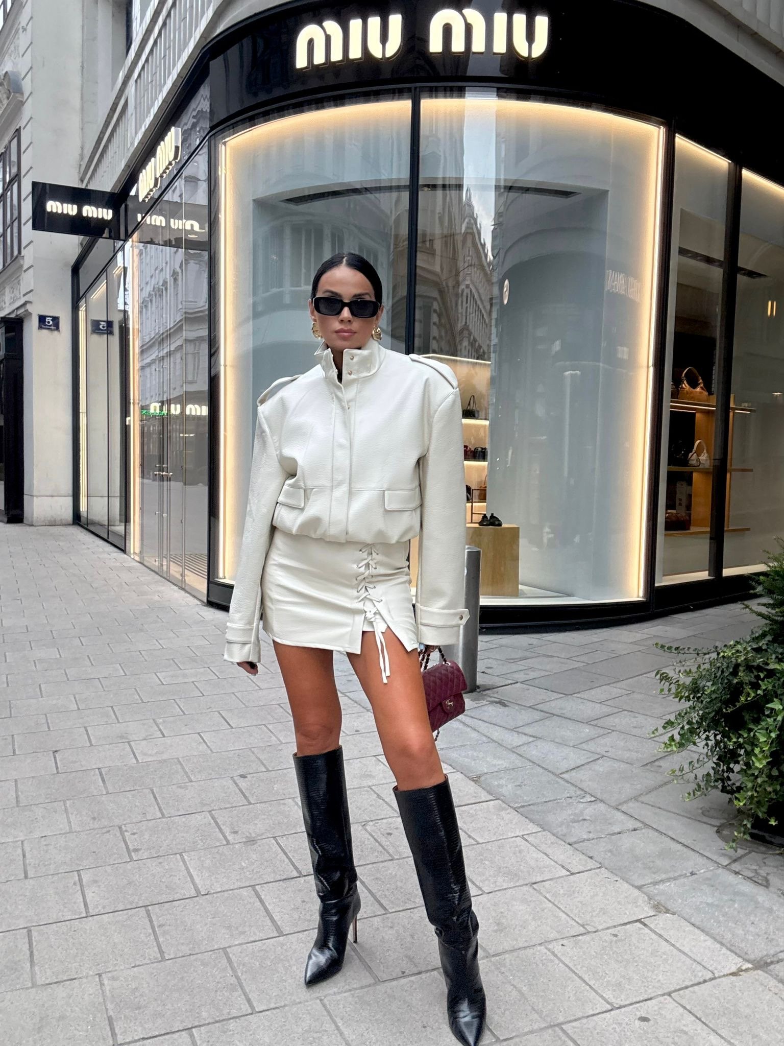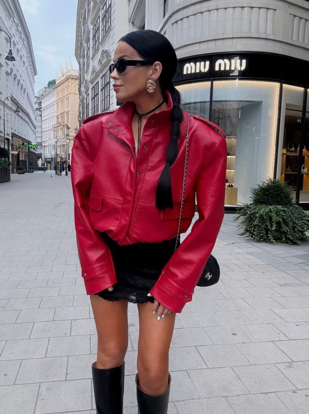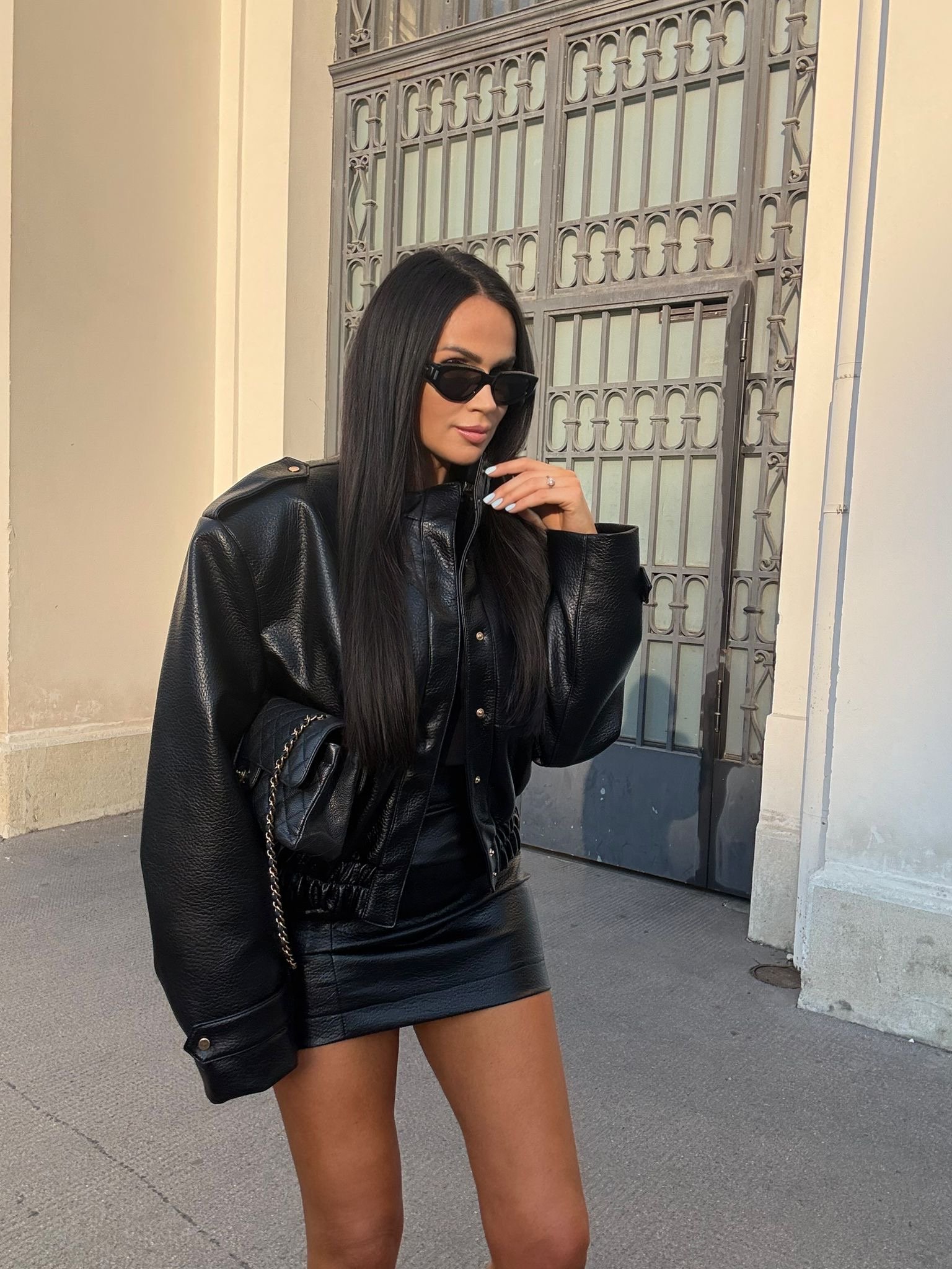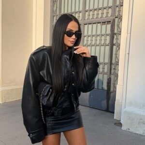 Jacket made from the highest quality Italian eco-leather. Bomber-style model, fastened with snap buttons and featuring a drawstring waist. One size.