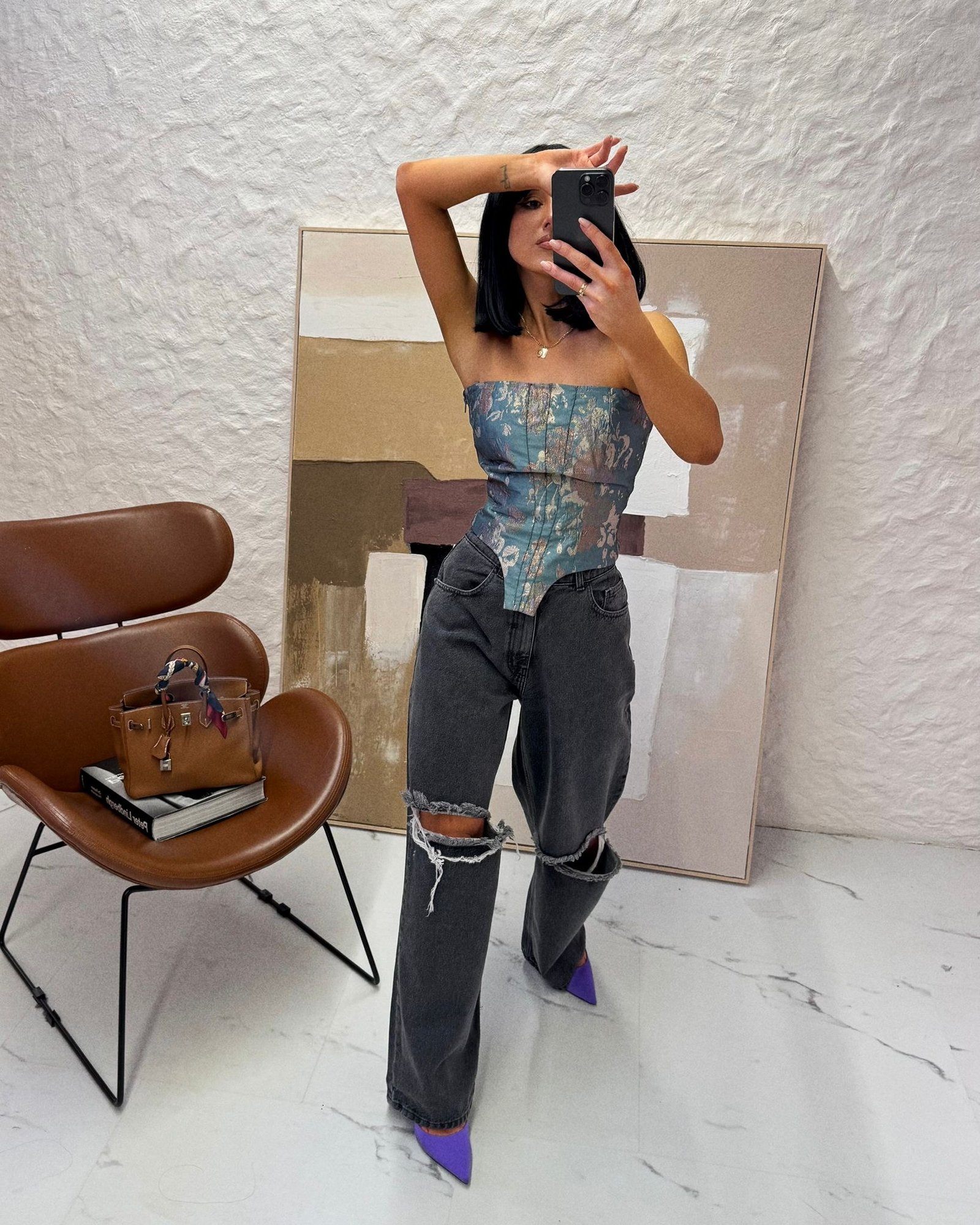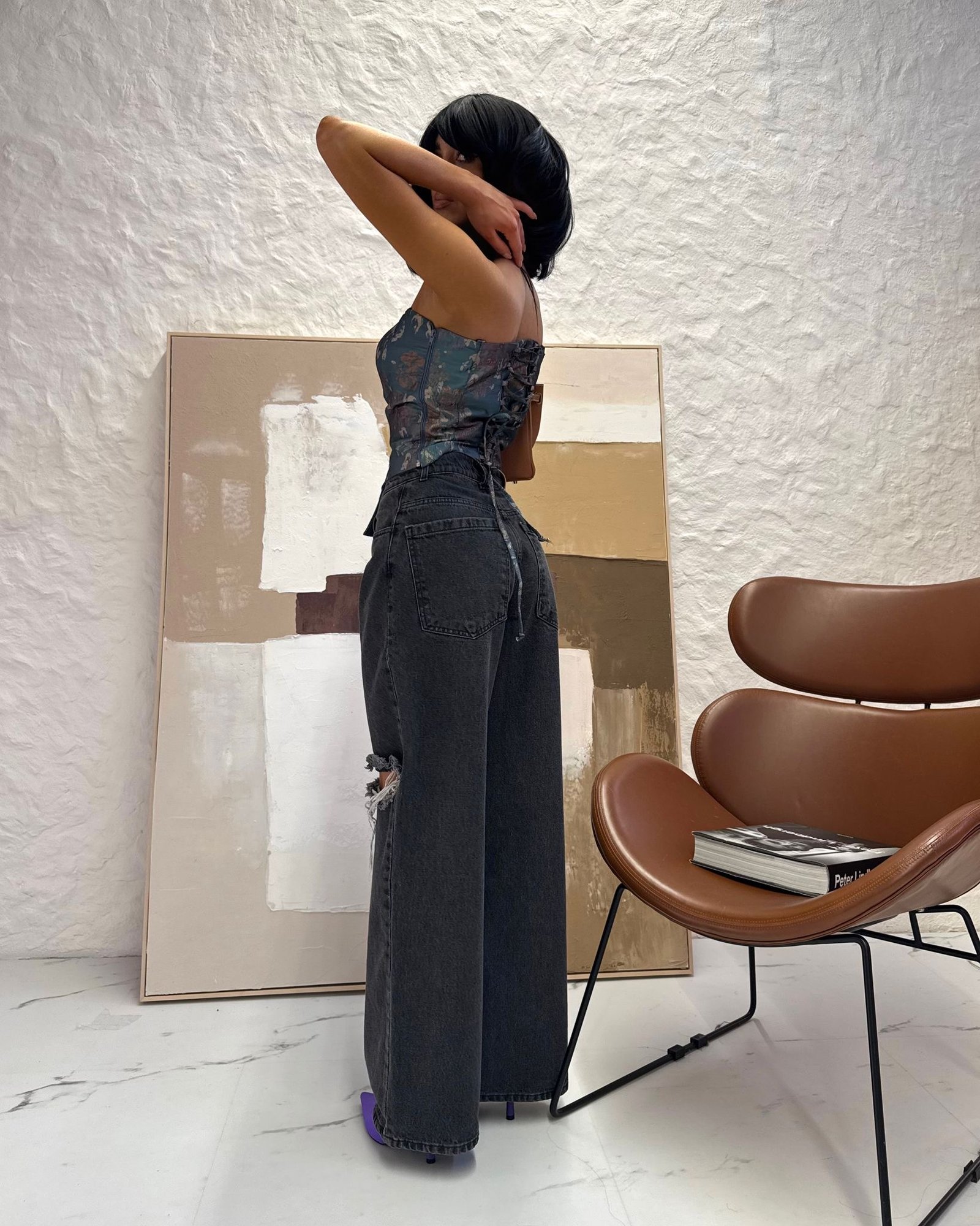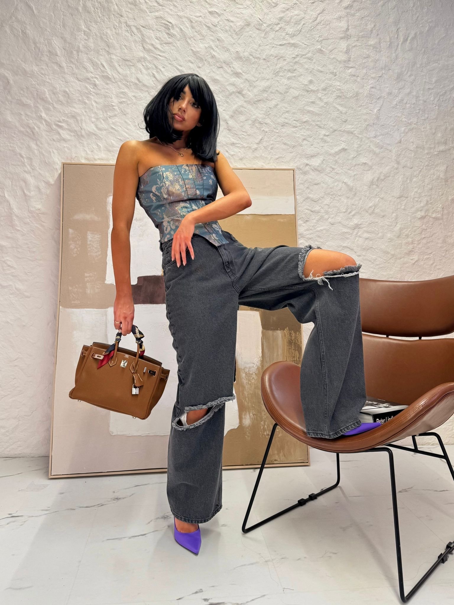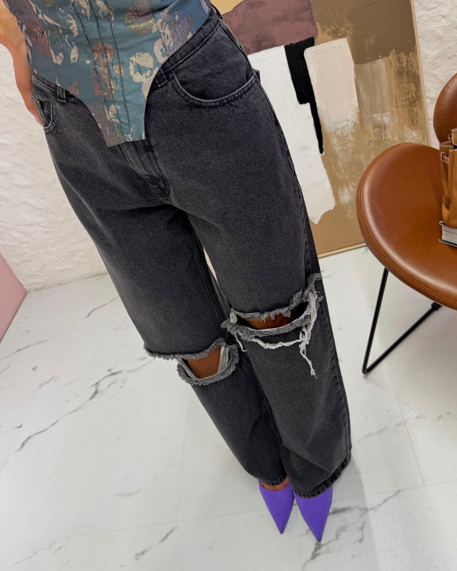Grey jeans with knee rips. Fashionable distressed denim. High-waisted, with a pink Lamilla label on the back.