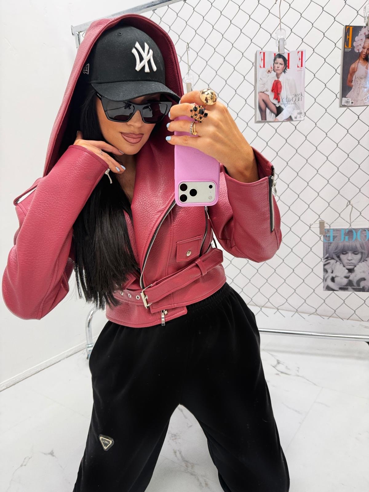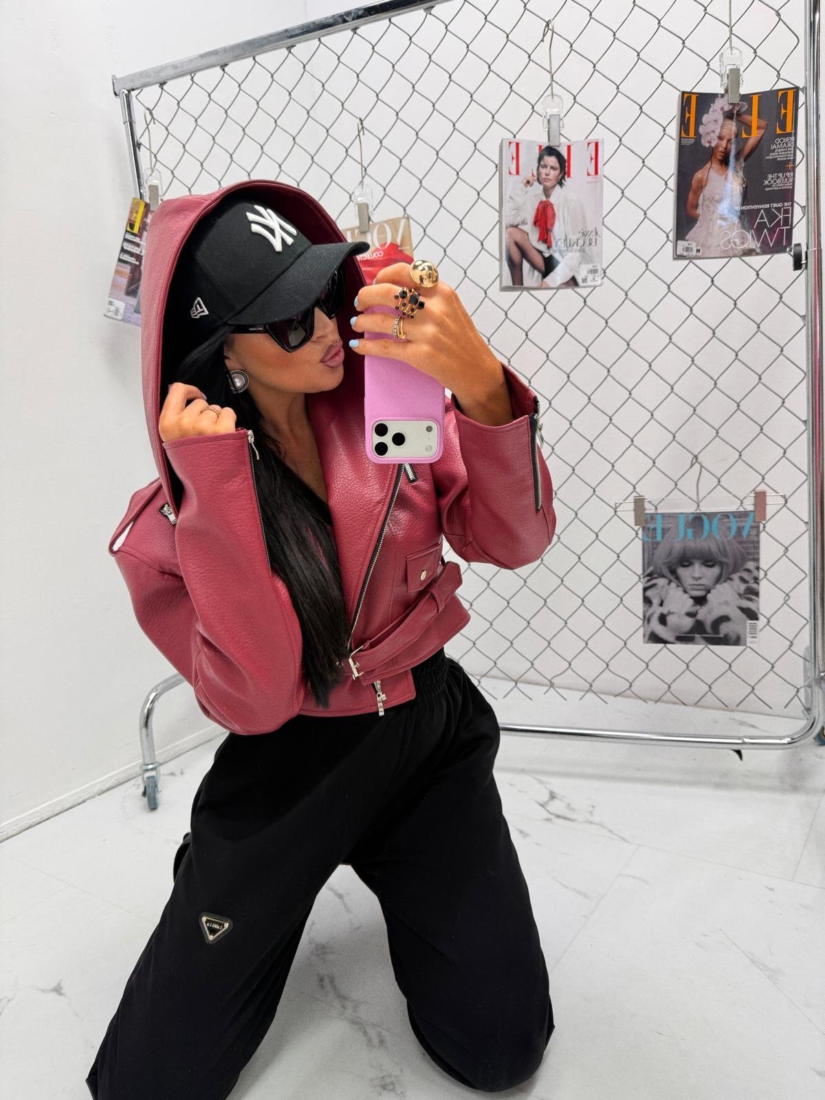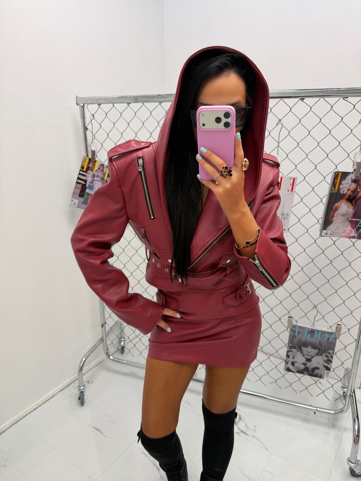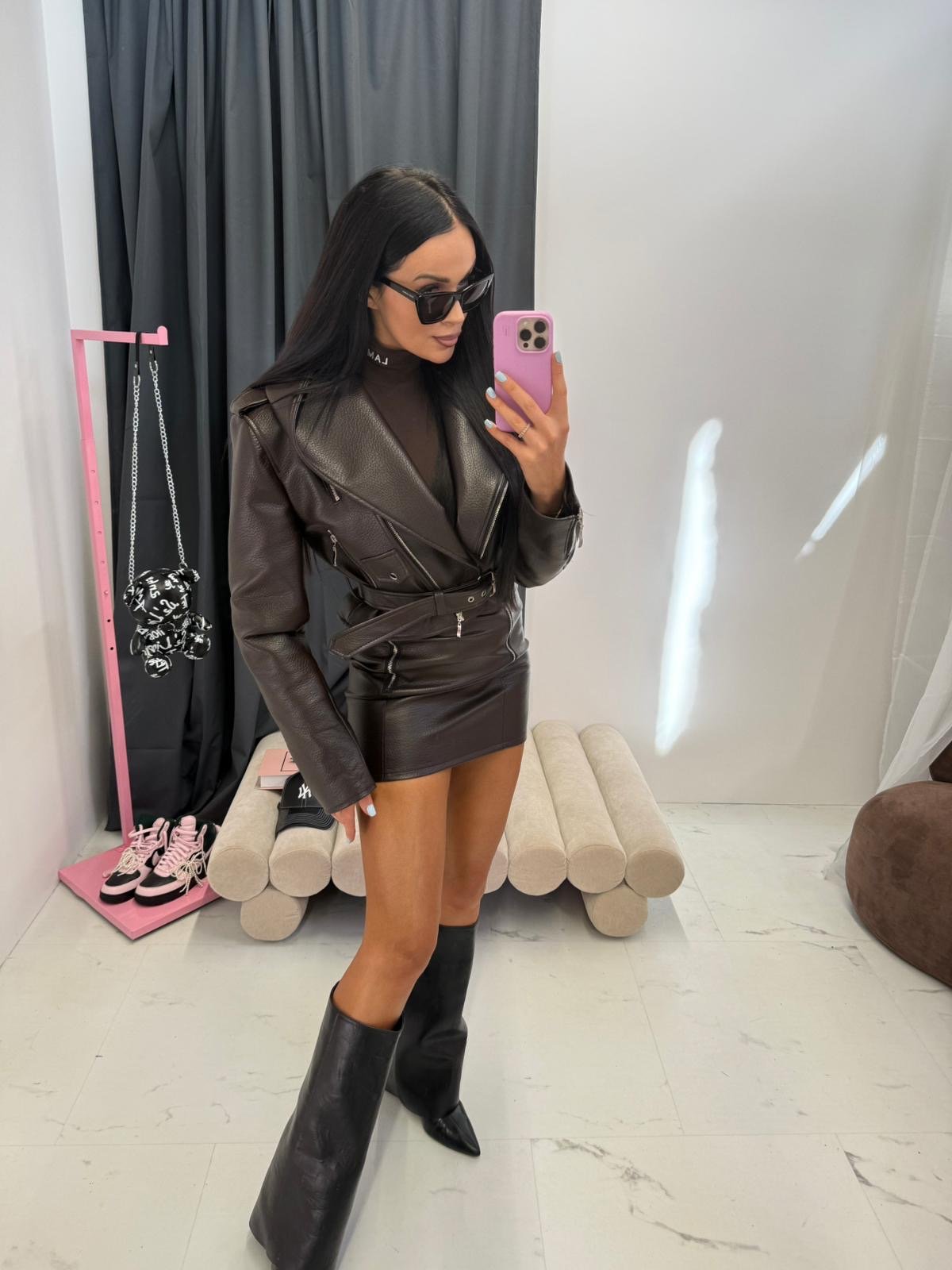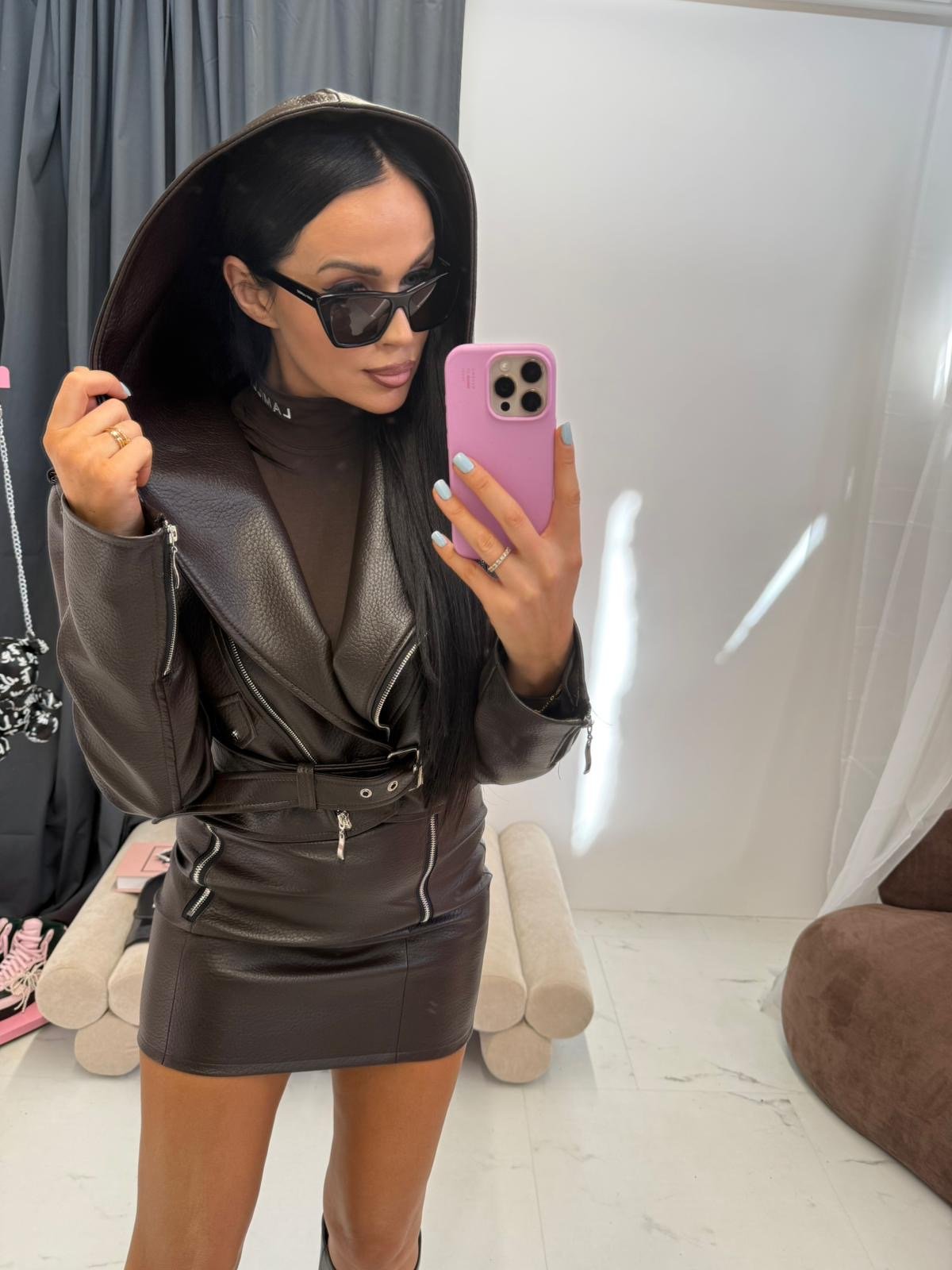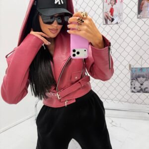 Hooded jacket made of the highest quality Italian eco leather. It features a waist belt. One size — recommended up to size L.