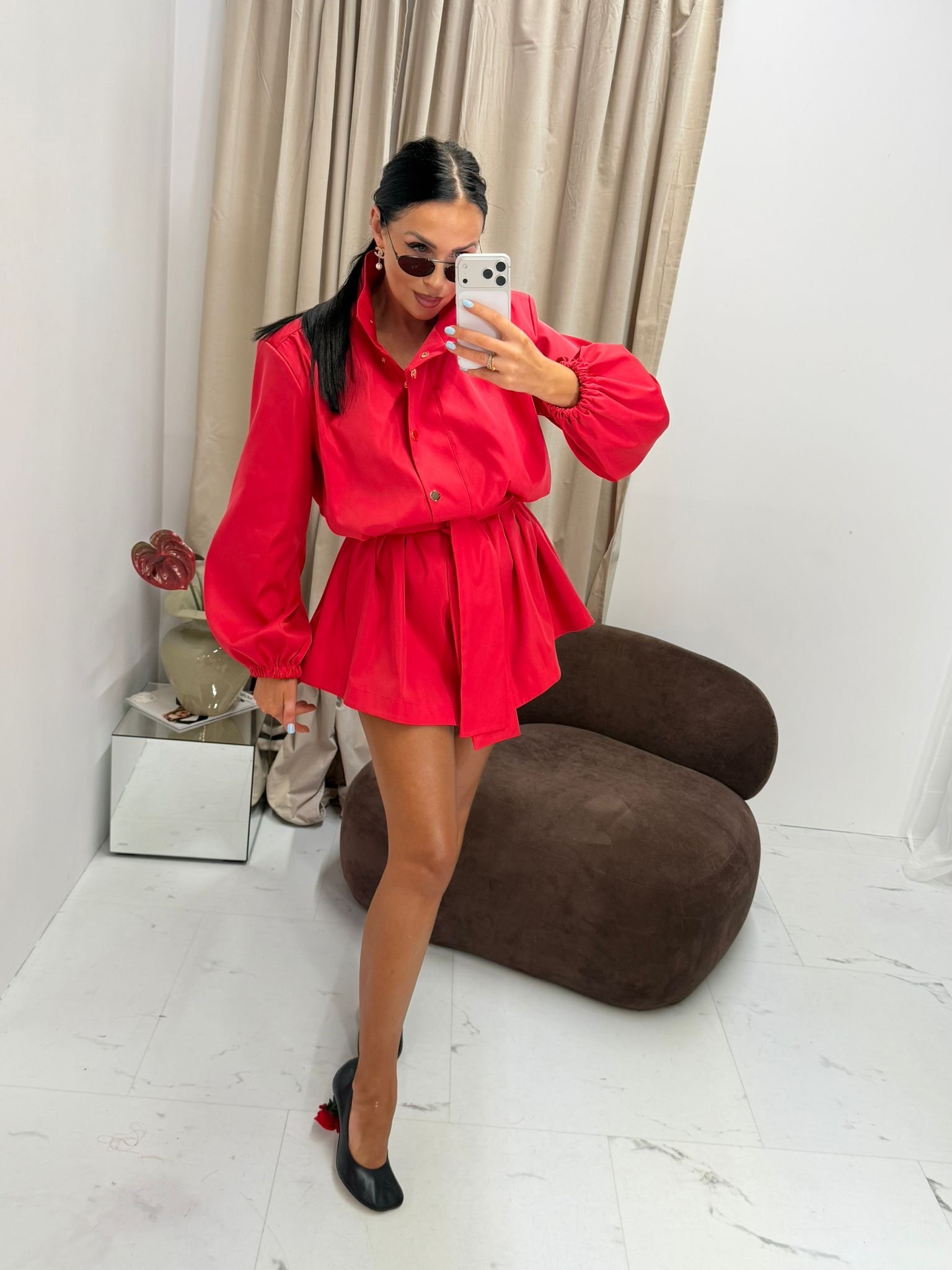 The design features striking puffed sleeves finished with elastic cuffs, as well as an elegant collar with decorative buttons.