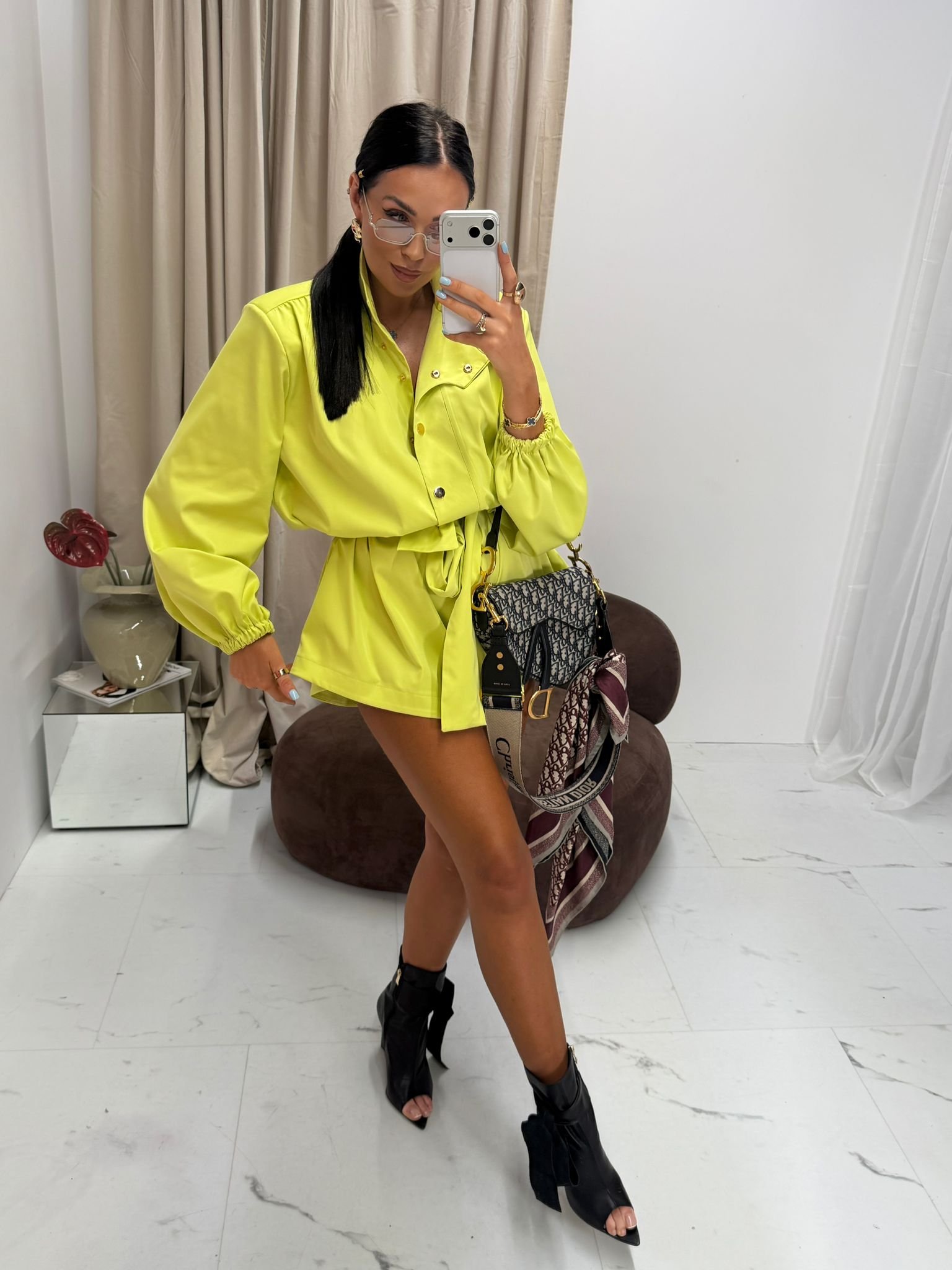 A tie at the waist allows for a perfect fit, accentuating the waist and giving the silhouette feminine proportions. One size fits all.