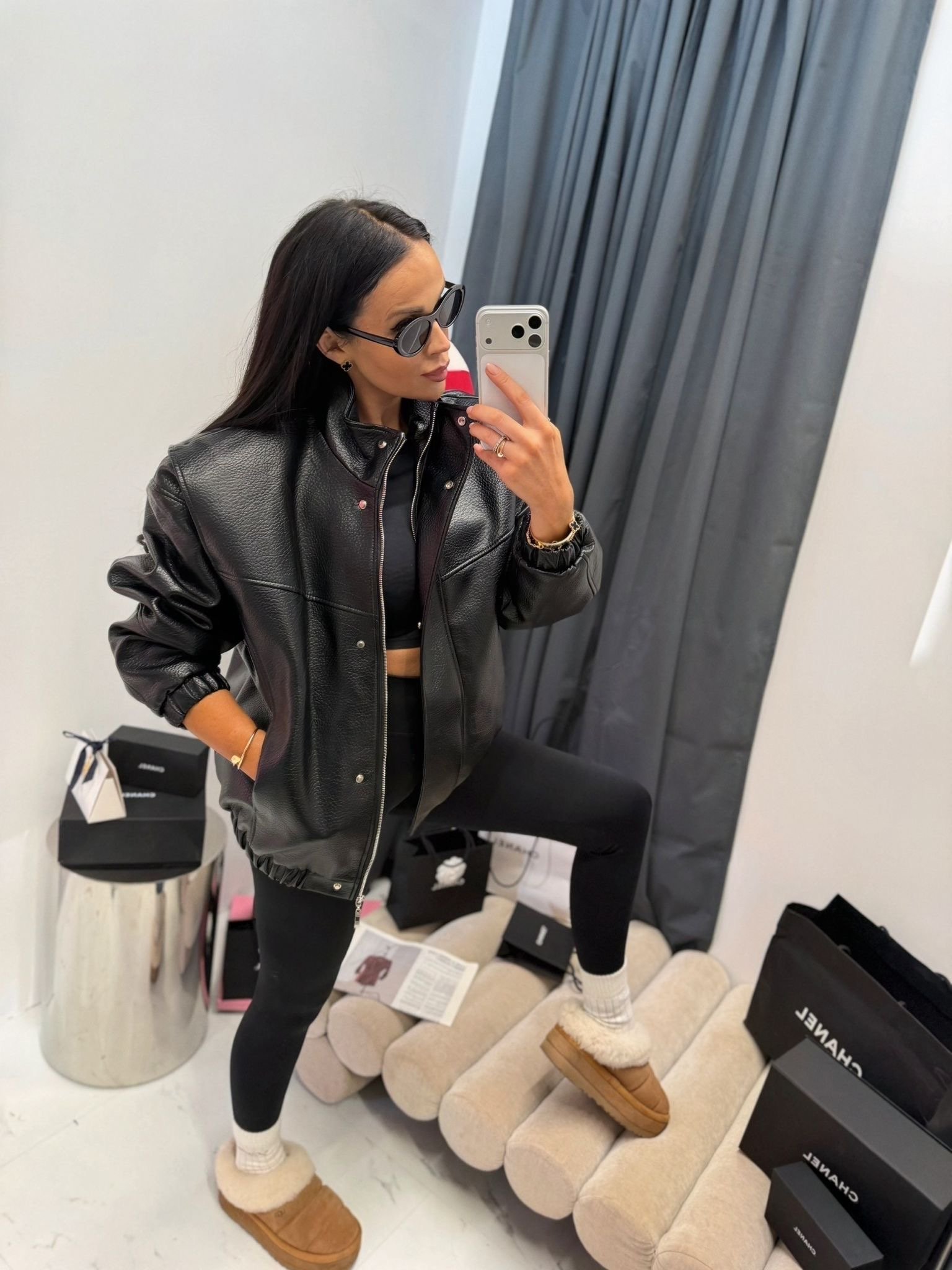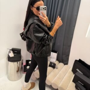 Insulated bomber-style jacket made of top-quality Italian vegan leather. One-size-fits-all. Ribbed hem at the bottom, zip fastening.