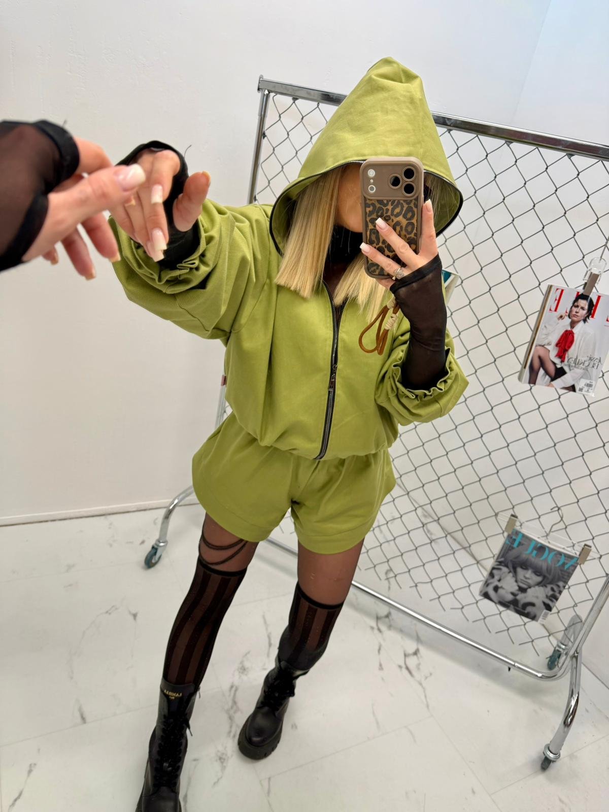 Hooded jacket made of lightweight denim, fastened with a zipper. Elastic cuffs at the waist and sleeves.