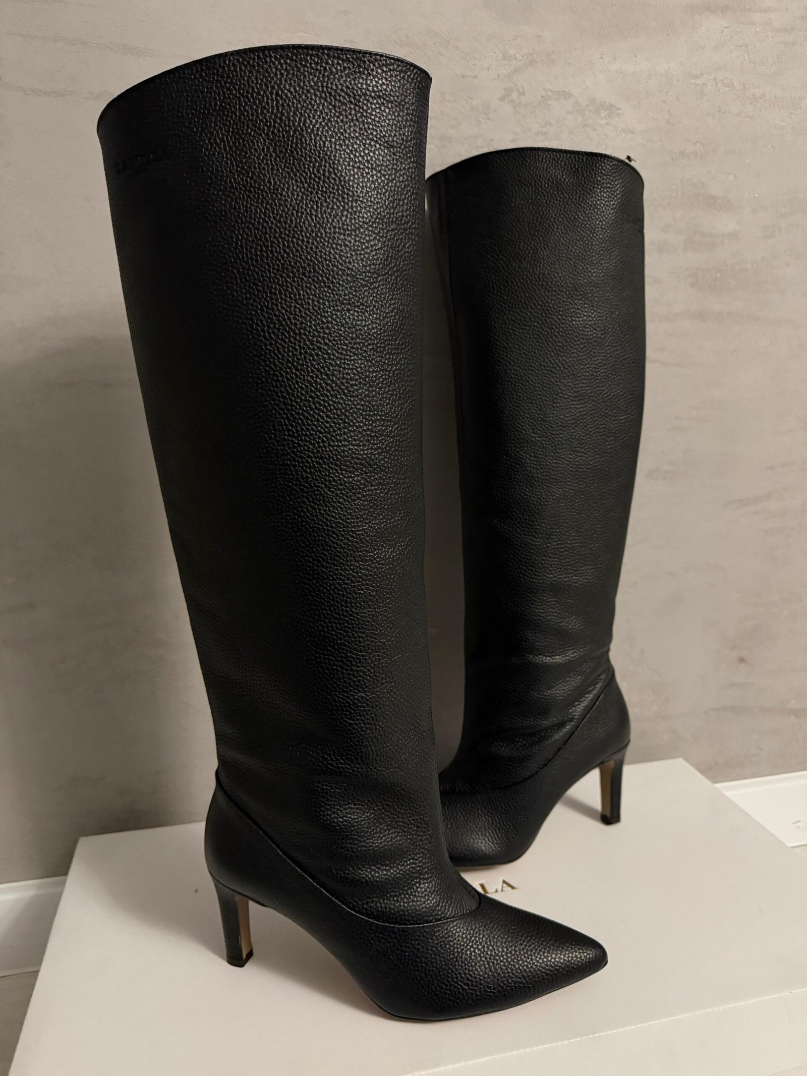 Heeled boots made of genuine leather. Premium quality. The heel is not high. Very subtle embossed Lamilla brand logo. Wider shaft.