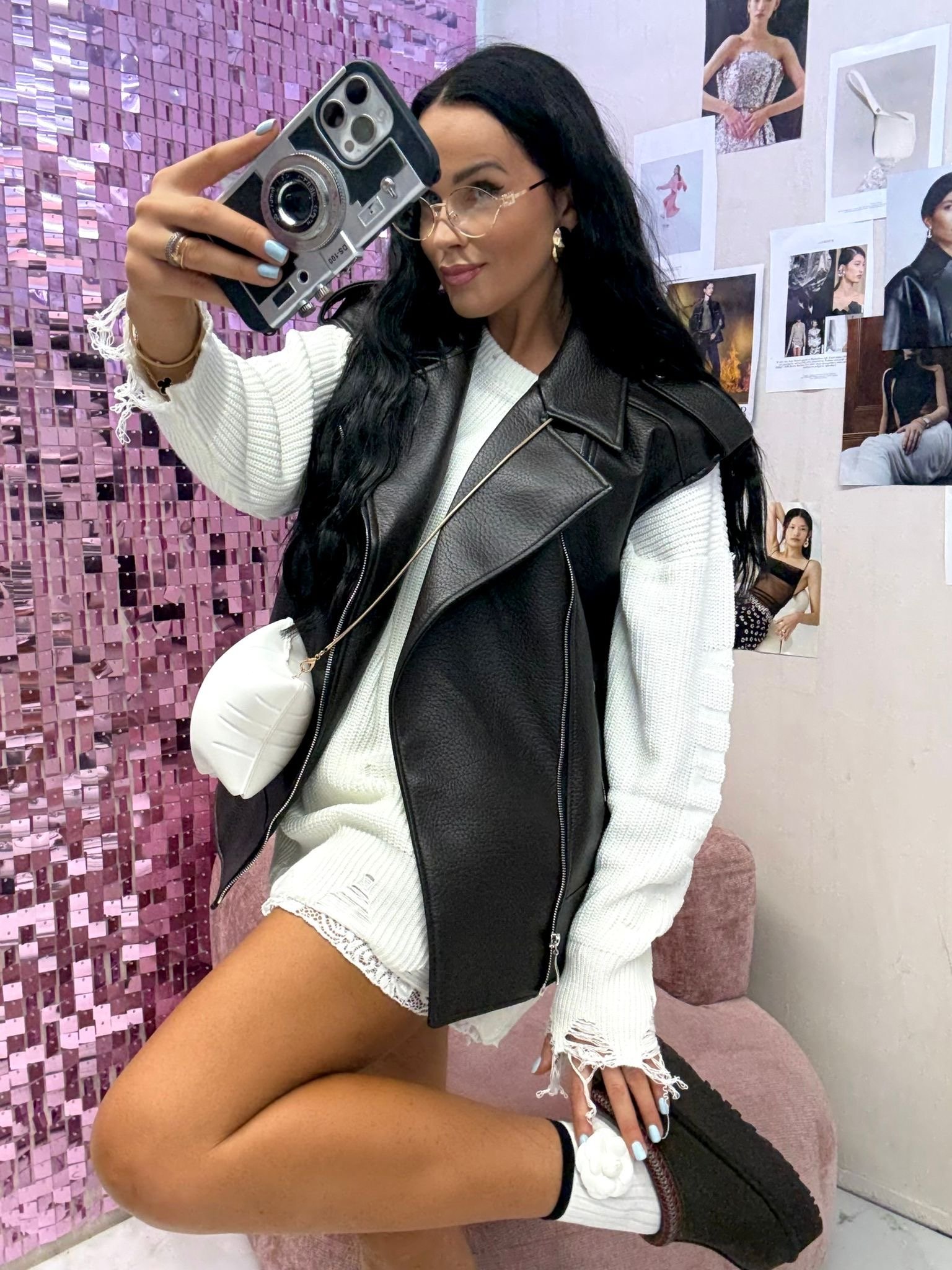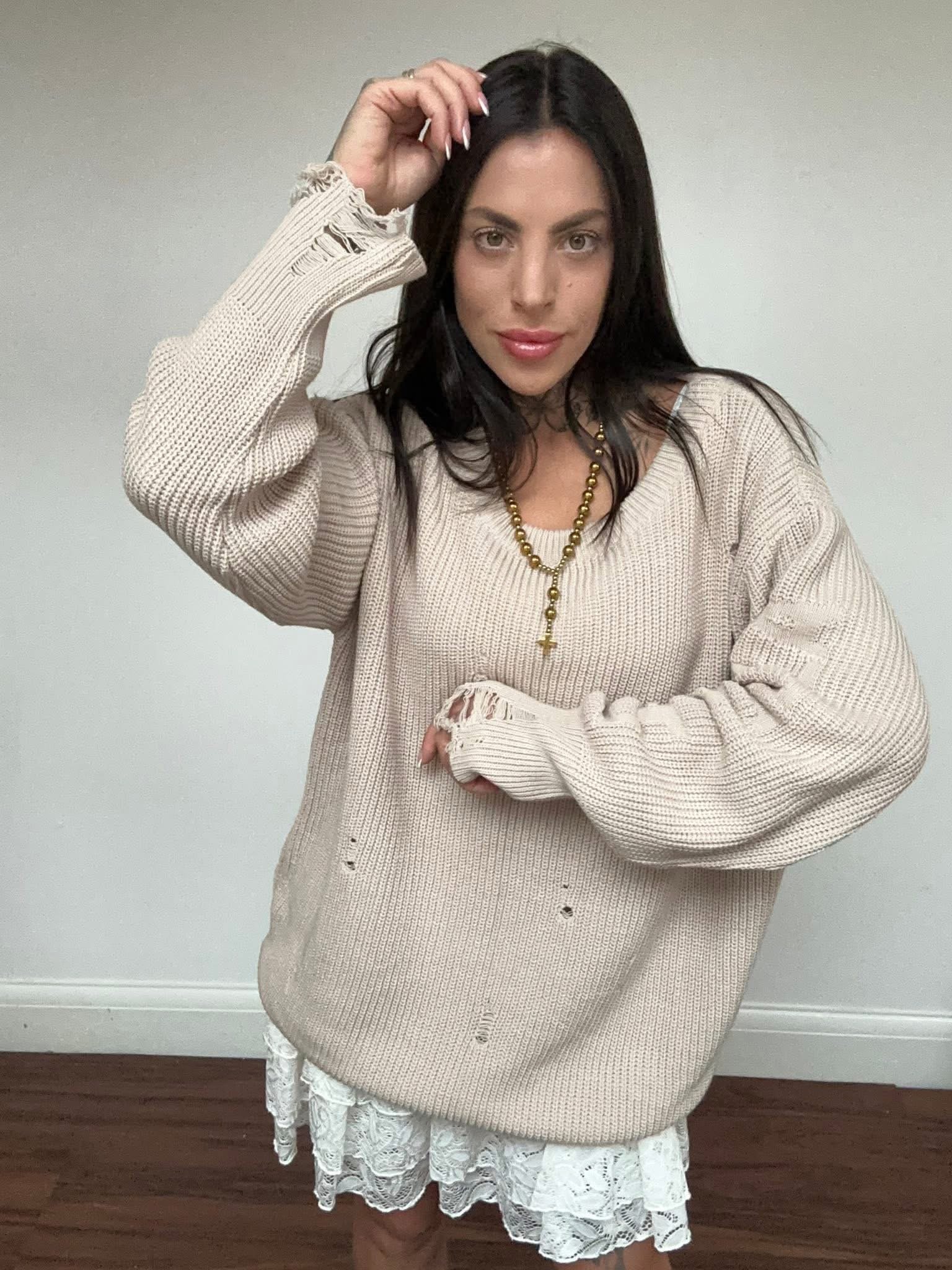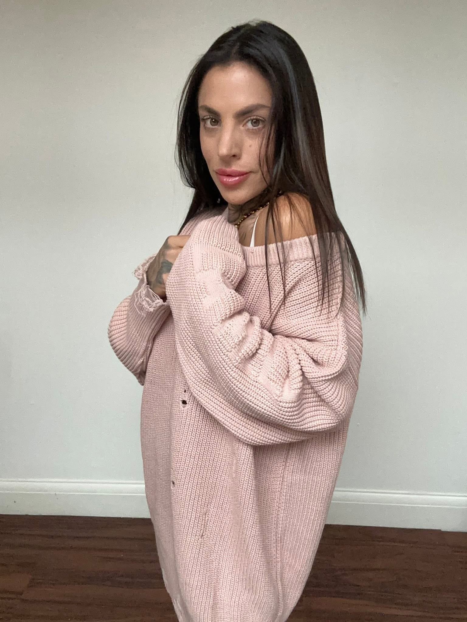 Sweater tunic by Lamilla. Branded on the sleeve. Distressed effect on the cuffs and throughout the sweater. One size